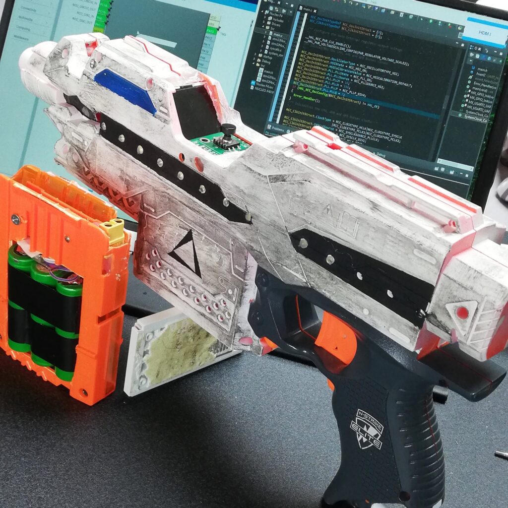 Ich verwende eine selbst entworfene Platine mit einem STM32 Mikrocontroller drauf. Ein Funkmodul, Bluetoothmodul, Lautsprecher, LED’s, Infrarot Sensoren, eine Infrarot LED und ein Display werden davon gesteuert. Für „realistischen“ Rückstoß ist auch noch ein Solenoid verbaut. Das Ganze ist momentan noch mit Heißkleber in eine umgebaute Nerf Gun eingebaut, aber für einen Prototypen reicht das. Geplant ist auch noch, weitere Sensoren am Körper anzubringen, um nicht nur an der Waffe treffbar zu sein. Wie vorhin bereits schon erwähnt, soll es auch noch kleine „Pods“ geben, welche als einnehmbare Flagge, Basis, Respawnpoint oder sonstiges verwendet werden können.